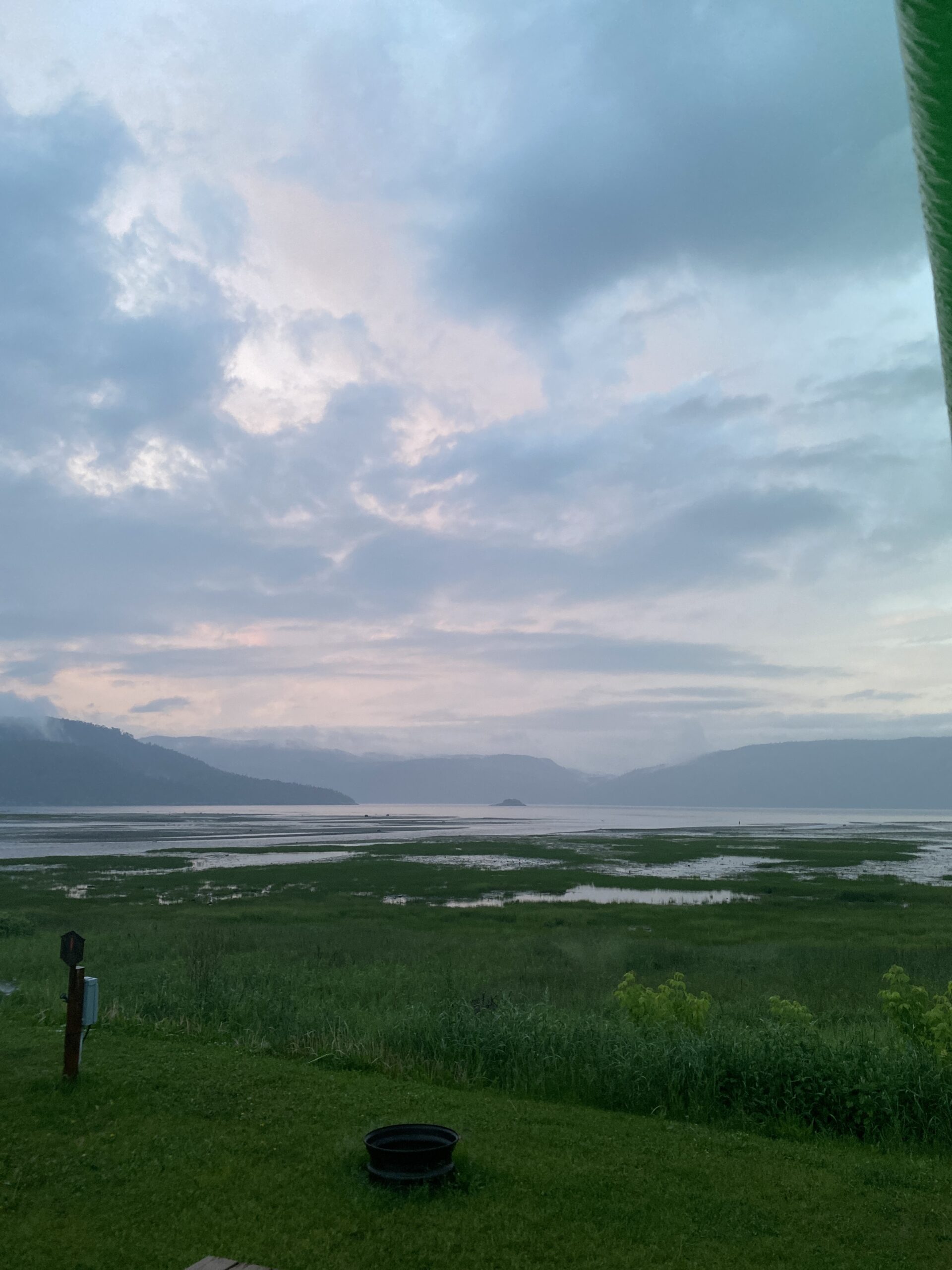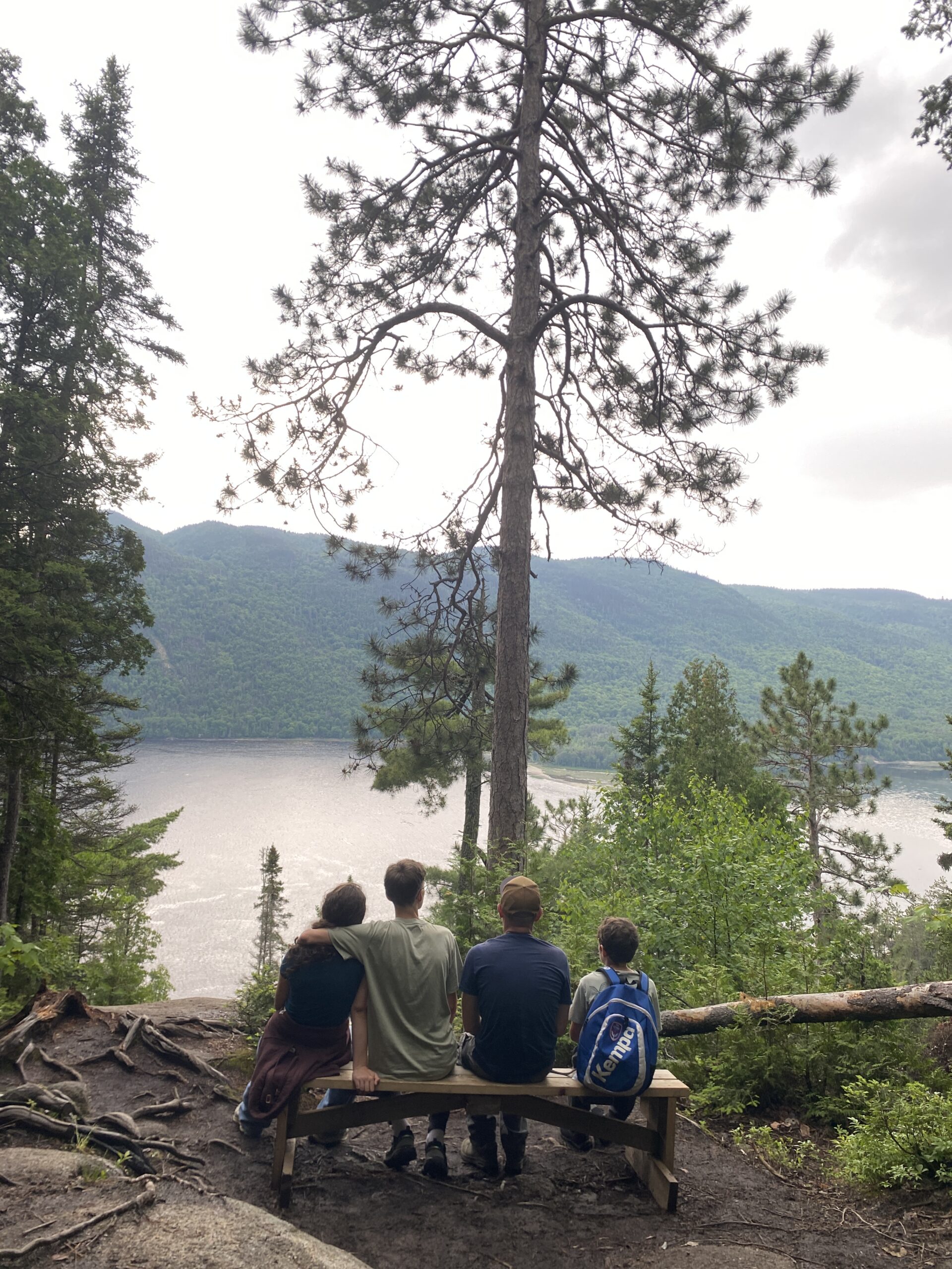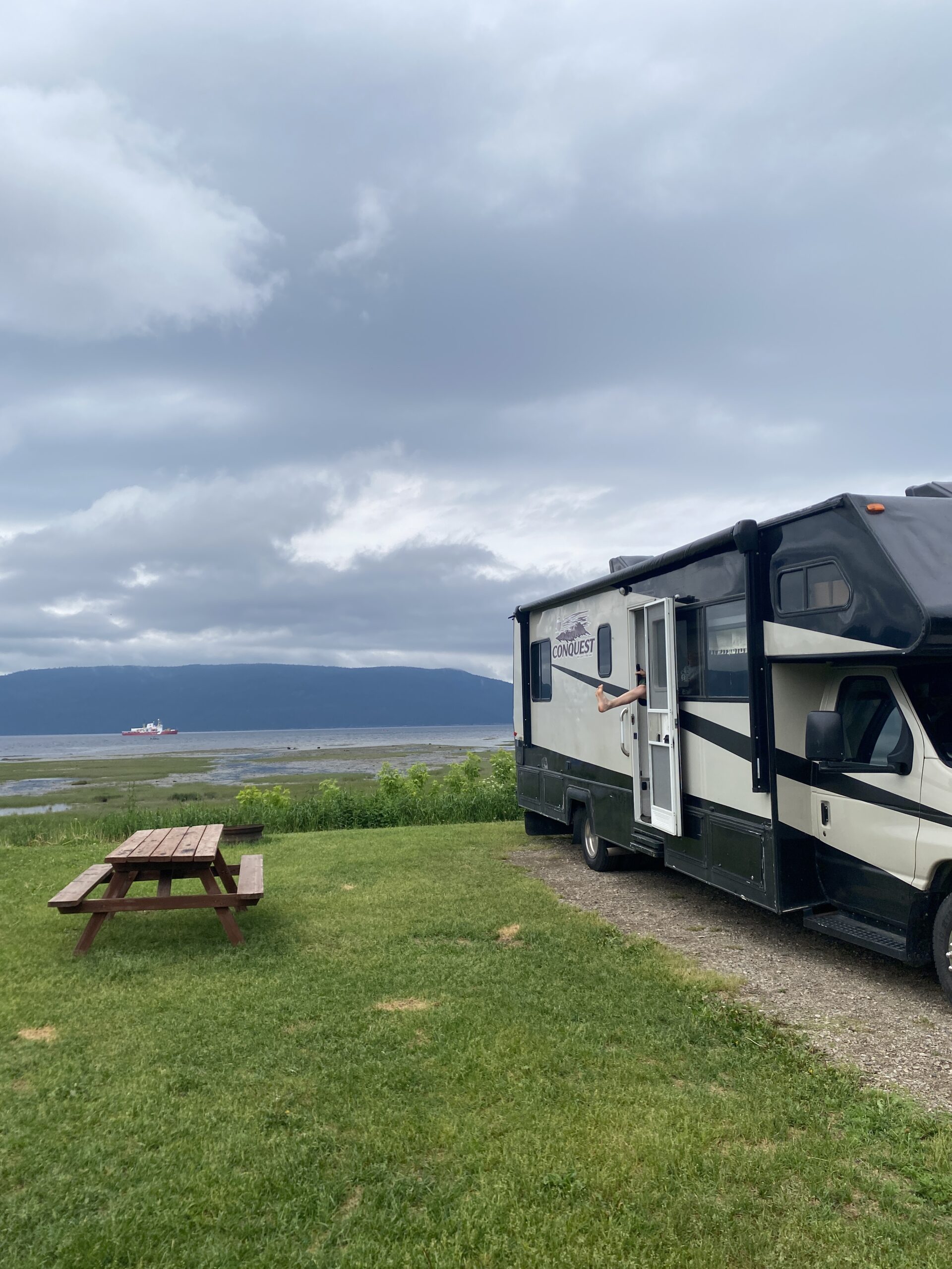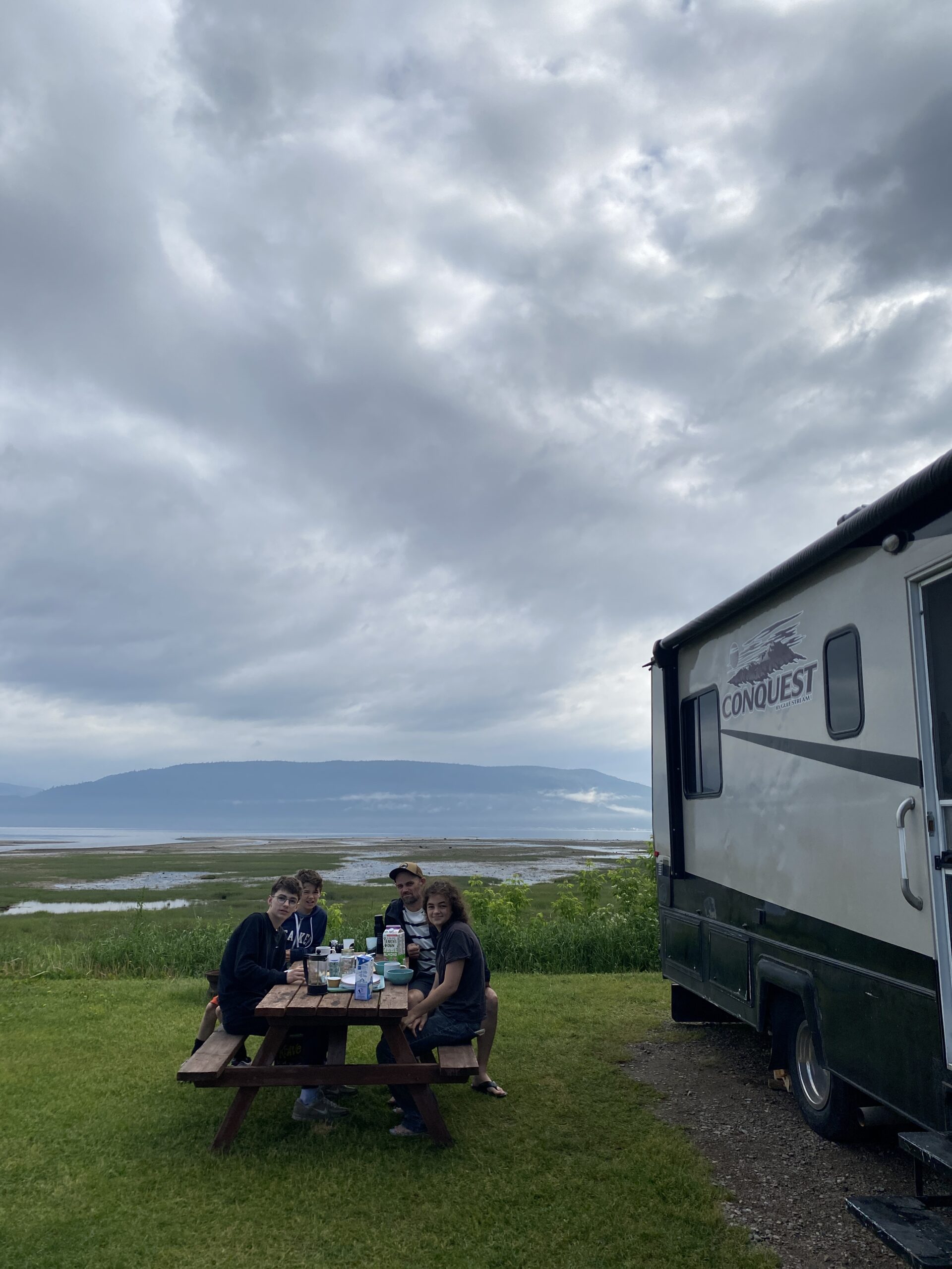 Notre plan pour le soir étant libre, on se laisse séduire par un petit camping au bord du fjord, découvert lors d’un de nos arrêts sur la route, à l’Anse-Saint-Jean. Les emplacements avec vue directe sur le fjord sont en effet très tentants! On s’installe, les enfants partent explorer le camping et on file se balader sur le post de l’Anse-Saint-Jean et déguster une glace! De retour, on a juste le temps de faire une partie de tennis avant que l’orage n’arrive! Ce sera dont soirée jeux de société car pas de feu ce soir au vu de la météo!